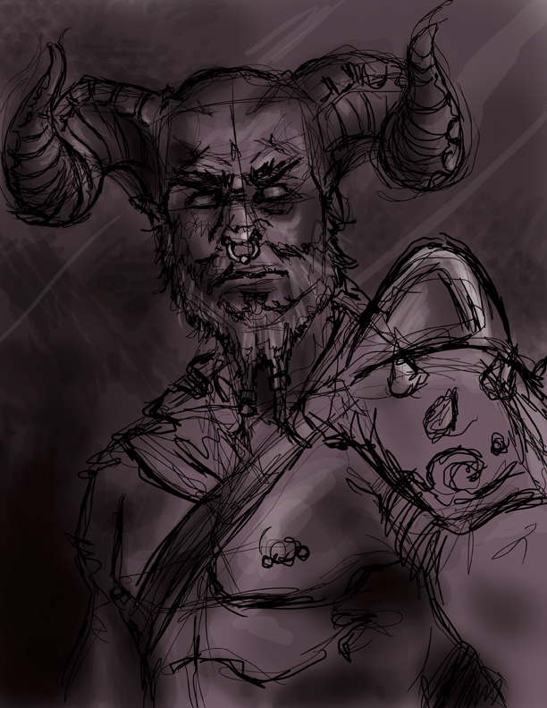 In Photoshop with my tablet (sigh, which seems to be best buddies with my travel pallet now) I began a sketch of a profile. Part of the challenge here is to keep away from my love of curved lines, and to play around a bit. He told me to try making the man candy into a zombie, pirate, or something else that was rougher and less....cheesecake.